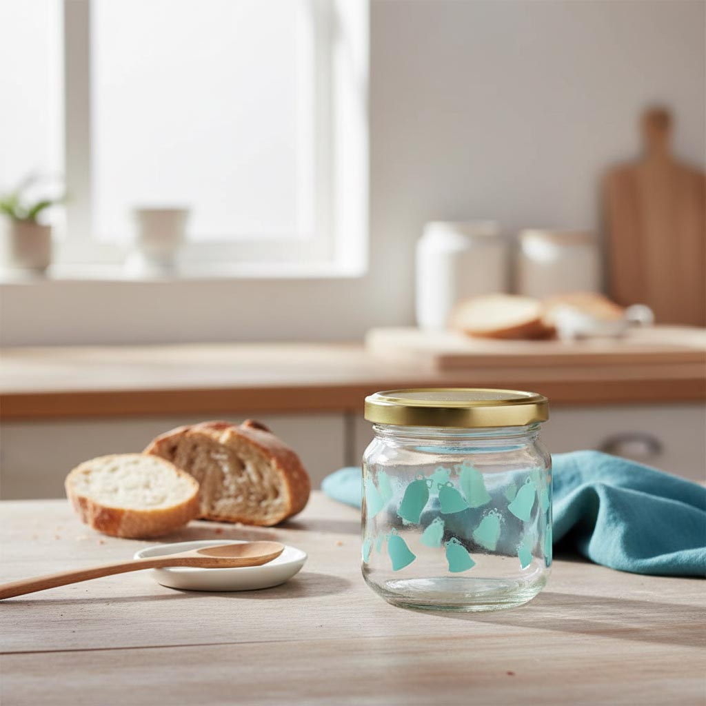 Bouteilles et bocaux 212 ml verre rond, motif : cloche, clochette, ouverture : Twist-Off (TO 66)