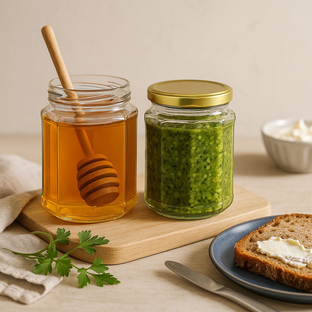 Les élégants verres polygonaux allient design esthétique et fonctionnalité pratique. Leur base à douze côtés leur confère une apparence particulière tout en permettant un rangement peu encombrant. Fabriqués en Europe, ils séduisent par leur finition de haute qualité et leur polyvalence. Que ce soit pour des pâtes aromatiques, des pestos épicés, des confitures fruitées ou du miel raffiné – ces verres offrent l’emballage parfait pour une grande variété de spécialités.