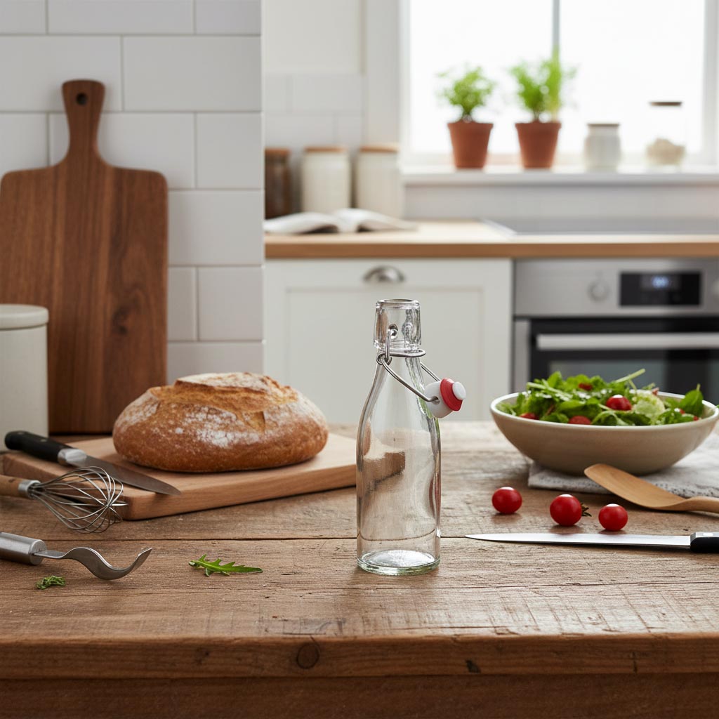 « Paul » est une bouteille en verre transparent de 200 ml avec une élégante forme rétro, adaptée au remplissage d'huiles, de spiritueux et d'autres produits. Elle est compatible avec un bouchon à bascule, résistante au froid et à la chaleur, ainsi qu'au lave-vaisselle, au micro-ondes et au four.