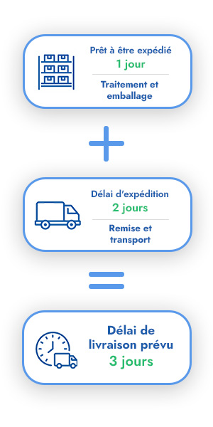 « Prêt à être expédié » désigne le délai nécessaire à notre entreprise pour traiter votre commande et la préparer pour l'expédition. Il commence à la réception de votre commande et se termine dès que votre colis est prêt à être récupéré par le prestataire de services d'expédition.